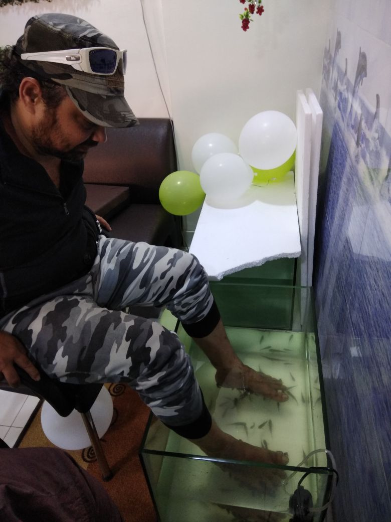 A fish spa involves dipping the feet in a tub of water filled with small fish called "Garra Rufa".