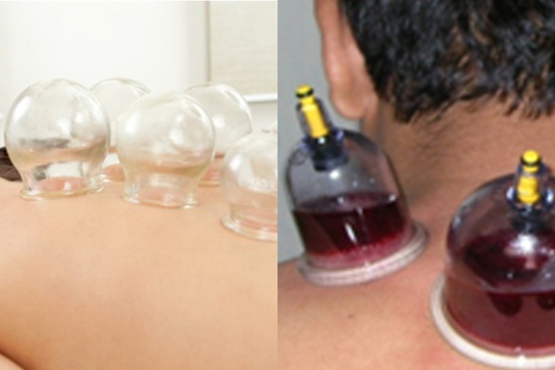 CUPPING/HIJAMAH: Cupping therapy is an ancient form of alternative medicine in which special cups are applied on the skin for few minutes to create suction. Cupping is of two types Dry and Wet.